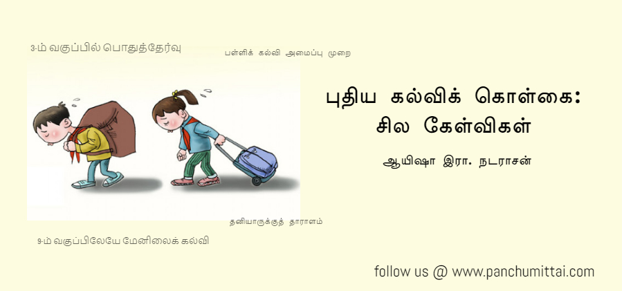 உலகின் வளர்ச்ச்சியடைந்த பல நாடுகளில் குழந்தையின் பள்ளி செல்லும் வயது ஐந்து என்று ஏற்கப்பட்டுள்ளது. காந்தியடிகள் முதல் தற்போதைய ஐரோப்பியக் கல்விக் கொள்கை, யுனெஸ்கோ பரிந்துரை உட்பட அனைத்தையும் பின்தள்ளி மூன்று வயது மழலைக்கு 5 ஆண்டு கல்வி என அதைப் பள்ளிக் கல்வியோடு இணைப்பது சரிதானா? குழந்தையின் ஆரம்பக் கல்வி தாய்மொழியில் இருக்க வேண்டும் எனும் நீண்ட காலக் கோரிக்கை என்ன ஆனது? இது குறித்து கல்விக் குழு அறிக்கை ஏதும் குறிப்பிடாதது ஏன் ?